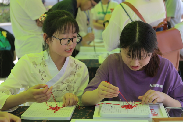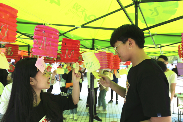 早早到场的崔戴飞等领导和参加本次活动的各社团学生们聊成一片,和汉服社的同学合照,与手工社同学交流剪纸刻纸技巧,与同学们一起猜灯谜、品古诗,学做中国结。