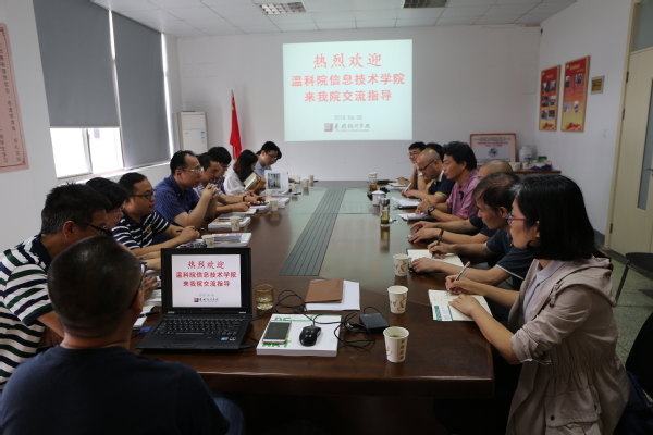 6月5日,温州科技职业学院信息技术学院崔晓军院长一行9人来艺术设计学院访问交流。艺术设计学院院长叶云龙、党总支书记徐有强,副院长,专业主任以及信息工程学院王真富副院长等参加座谈交流。