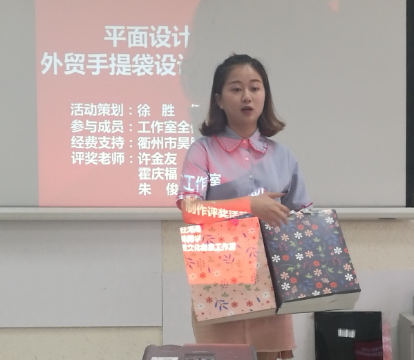 本次活动是该工作室商业包装设计课程中一个阶段性作业项目汇报,项目主题是该工作室合作企业衢州市昊胜文化创意工作室提供的企业实际项目“外贸包装手提袋设计制作”。该项目教学由企业负责人徐胜与工作室负责人任海燕共同完成。学生从最初主题切入构思、设计、印前、切割、制作、打孔、穿绳等环节到最终成品,都是独立完成。汇报现场学生从项目构思、方案策划、创意设计、作品打样、作品成型、商品展示、市场推广等各方面进行了项目设计阐述。