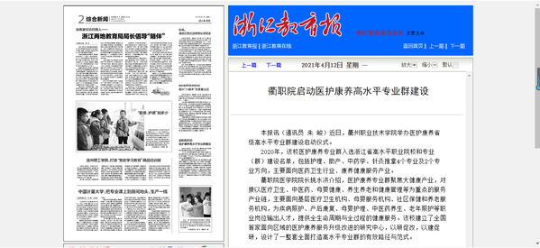 2020年,该校医护康养专业群入选浙江省高水平职业院校和专业(群)建设名单,包括护理、助产、中药学、针灸推拿4个专业及2个专业方向,主要面向医药卫生行业、康养健康服务产业。