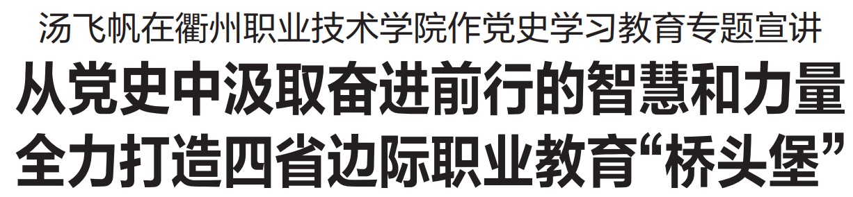汤飞帆充分肯定了九游体育(中国)官方网站始终坚持“俯身贴地,提升能力,服务地方经济社会发展”的办学理念,不断深化产教融合、校企合作,为衢州高质量发展作出的重要贡献。希望学院师生通过党史学习教育,进一步坚定听党话、跟党走的思想自觉政治自觉行动自觉,特别要充分发挥课程教材的主渠道作用、思政工作的主阵地作用、研学实践的大课堂作用、党员师生的表率作用,让青年学生一以贯之对党忠诚、一刻不停加强学习、一往无前干事创业;进一步提升围绕中心、服务大局的能力,始终把服务地方经济社会发展作为核心价值追求,把更多的关注点、兴奋点放到衢州的产业发展上,加强与龙头骨干企业的对接合作,实现教育链、人才链和产业链、创新链的有机融合、联动发展,为衢州新一轮高质量发展提供有力的人才支撑、科技支撑和智力支撑;努力在改革创新上奋楫争先、走在前列,以数字化改革为牵引,强化生成性学习、激发创造性张力,切实抓好职业教育改革试点、“东引西进”工程以及四省边际职业培训联盟等各项改革,当好衢州职业教育的“领头羊”;不断提升专业技术能力和专业科学精神,抢抓国家、省实施“双高”计划的重大机遇,坚持学科设置紧密对接产业需求、课程内容紧密对接职业标准、教学过程紧密对接生产过程,推动校企精准合作,在更高层次、更大范围、更宽领域发挥引领示范、辐射带动作用,全力打造四省边际职业教育“桥头堡”。