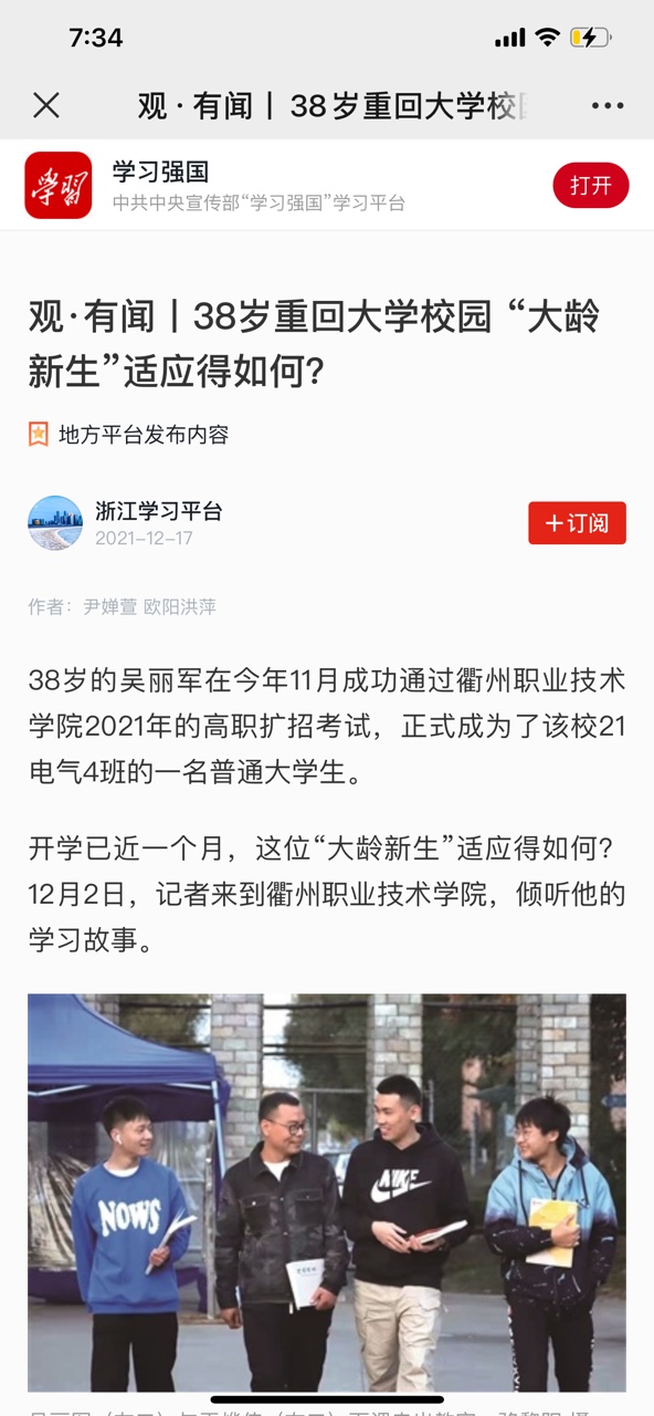 “我是丽水人,高中毕业时原本有机会上大学,但因为种种原因没能如愿,这是我之前人生中的一个遗憾。”他告诉记者说,去年来衢州出差时,了解到九游体育(中国)官方网站的电子自动化专业正在进行高职扩招考试,抱着试试看的心情,他忐忑地复习备考,没想到一举考上了。