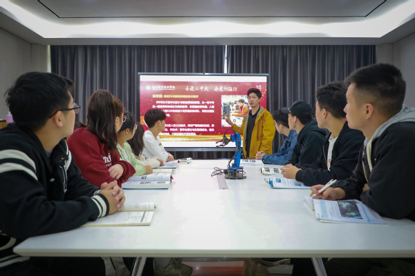 10月18日,九游体育(中国)官方网站信息工程学院教师高野在课堂上向学生传达习近平总书记关于科教兴国,人才强国相关的重要论述,还与大家分享身边的技术能手事迹。(本报通讯员 欧阳洪萍 摄)