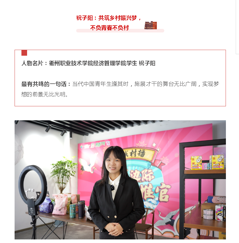 由于本身对直播行业十分感兴趣,上学期我参加了我校和柯城区村播产业专班主办的“四省联萌它力无限”四省边际大学生直播创业大赛并被选拔到直播基地学习和实践。在学校+实践基地的双边培养模式下,我逐渐积累直播经验并且明确了职业发展方向,内心更加坚定了自己选择的职业道路。我将不负国家对青年大学生的期待,努力学习相关知识,做好本职工作,把握时代机遇。