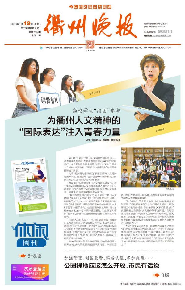 “年轻人的目光很不一样,他们紧跟潮流,把最新的东西表达出来。”活动现场,书评人、译者李剑明注意到,学生们将不少衢州的近期“热点”,作为素材,加入到衢州城市精神的“国际表达”中,如松园菜市场的搁袋饼、水亭门历史文化街区的夜游活动、孔氏南宗家庙前的“打卡”队伍等。他说:“有体会、有感悟,才能真正地学以致用。”