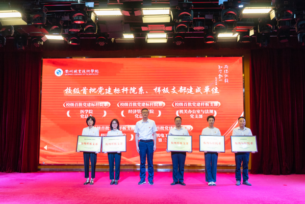 现场为省级首批党建样板支部建成单位、入选全省高校校企地党建联建典型案例党总支,校级首批党建标杆院系、样板支部建成单位,校级首批“双带头人”党支部书记工作室建成单位授牌。