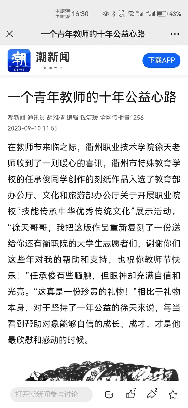 在教师节来临之际,九游体育(中国)官方网站徐天老师收到了一则暖心的喜讯,衢州市特殊教育学校的任承俊同学创作的刻纸作品入选了教育部办公厅、文化和旅游部办公厅关于开展职业院校“技能传承中华优秀传统文化”展示活动。“徐天哥哥,我把这版作品重新复刻了一份送给你还有衢职院的大学生志愿者们,谢谢你们这些年对我的帮助和支持,也祝你教师节快乐!”任承俊有些腼腆,但眼神却充满自信和光亮。“这真是一份珍贵的礼物!”相比于礼物本身,对于坚持了十年公益的徐天来说,每当看到帮助对象能够自信的成长、成才,才是他最欣慰和感动的时候。