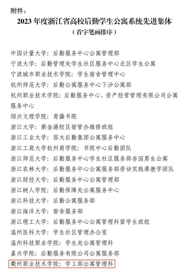 近日,浙江省教育后勤基建协会学生公寓管理专业委员会公布了2023年“浙江省高校后勤公寓系统先进集体”,全省本专科共有20所高校获此殊荣,我校榜上有名。