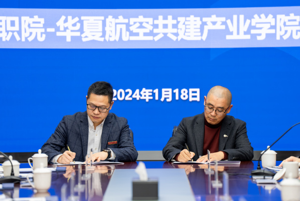 1月18日,衢职院-华夏航空控股战略合作协议签约暨产业学院成立揭牌仪式在我校举行。华夏航空控股(深圳)有限公司总裁张工,华夏航空控股(深圳)有限公司副总裁、华夏蓝翼教育科技(衢州)有限公司董事长吴成富,我校党委书记徐须实,党委副书记、校长吕延文,党委委员、副校长姚水洪参加,签约仪式由校党委副书记何百通主持。