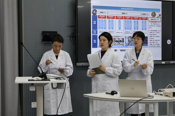 决赛分教学实施报告介绍、一段无生教学展示、答辩三个环节。决赛现场,各参赛团队按抽签顺序依次比赛。参赛教师准备充分,教学实施过程设计合理,语言表达生动准确,展示了各自精湛的教学技能和良好的教学风采,给现场评委和观众呈现出充满魅力的课堂。评委们本着科学、公正、公平的原则,对各参赛团队的综合表现进行现场评分。