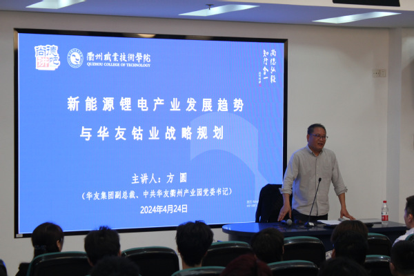 4月24日下午,我校“尚德讲吧”邀请华友集团副总裁、华友衢州产业园党委书记方圆作“新能源锂电产业发展趋势与华友钴业战略规划”主题讲座。校党委委员、宣传部部长孔庆红主持。