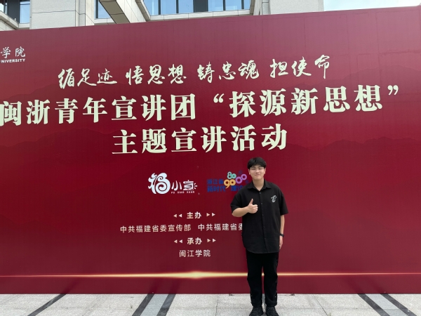 4月28日至30日,由福建省委宣传部、福建省委讲师团主办的“循足迹 悟思想 铸忠魂 担使命”闽浙青年宣讲团“探源新思想”主题宣讲活动在福州市举办。浙江省“8090”和“00后”新时代理论宣讲走亲团受邀至福建与“福小宣”青年宣讲员共同走进福建农林大学、闽江学院、福建师范大学展开宣讲,并在师生中引发了强烈反响。浙江省“00后talker”宣讲团成员、我校00新时代理论宣讲团团长郑德镇同学作为全省高校唯一代表参加。