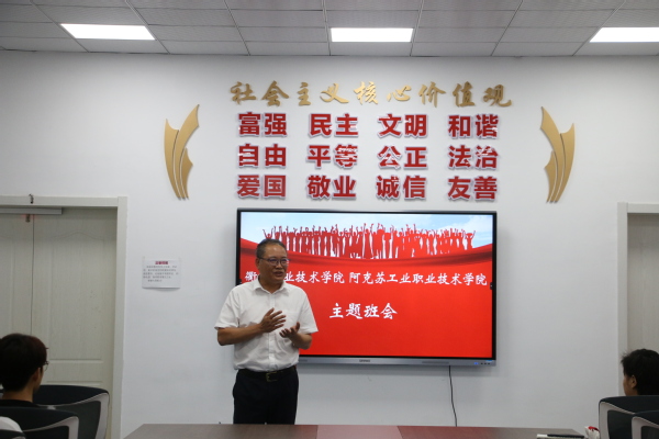 6月19日下午,学校组织“花开衢职”石榴红宣讲团、00新时代理论宣讲团与阿克苏工业职业技术学院师生代表举行主题班会,校党委委员、宣传部(统战部)部长孔庆红,机电工程学院党总支书记朱峻参加活动。活动中,浙江省“00后talker”理论宣讲团成员、我校00新时代理论宣讲团团长郑德镇与大家分享了参加浙闽青年宣讲交流活动的亲身感受并与阿克苏工业职业技术学院师生交流青年理论宣讲工作的收获。