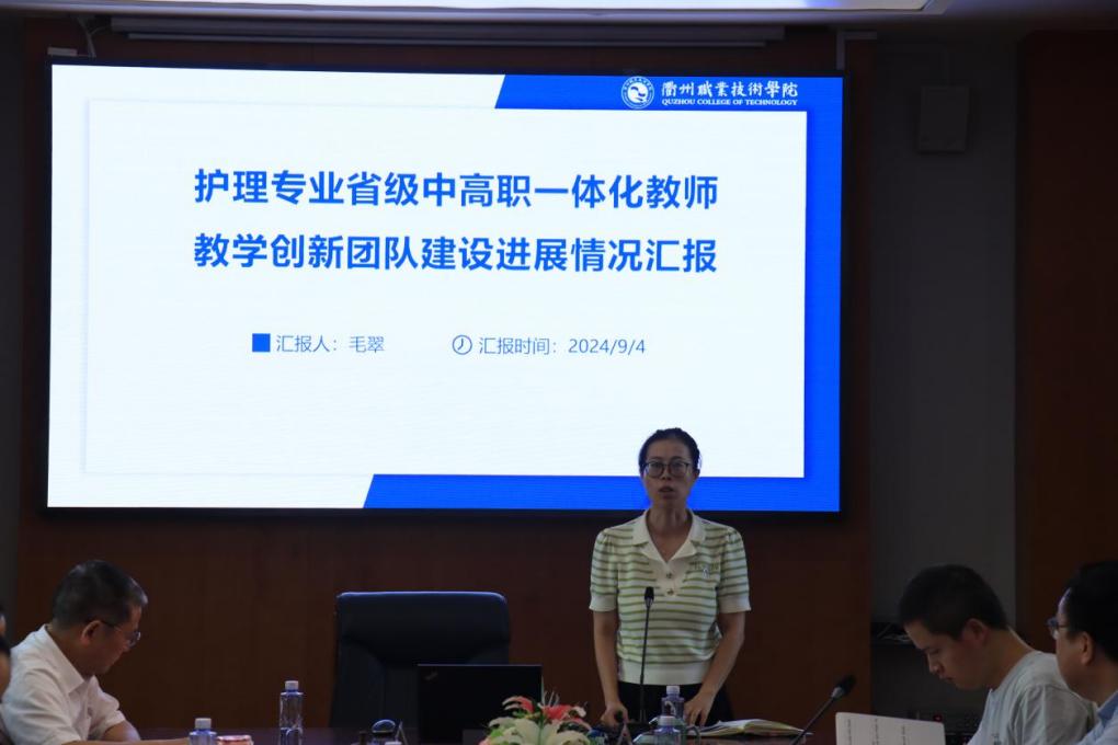 浙闽赣皖医护康养服务能力重构研究中心副主任毛翠汇报浙江省中高职一体化教师教学创新团队建设情况,对创新团队的建设进展进行了全面总结。