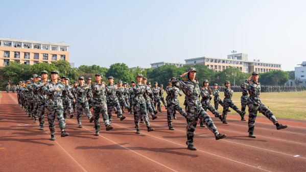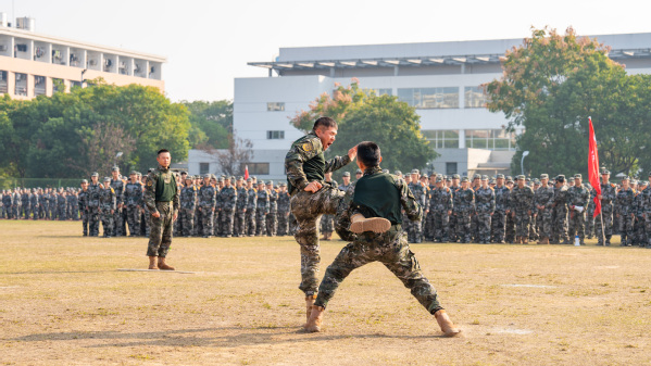 承训教官为全体新生表演了战术、格斗和武术,迅疾的动作尽展飒爽英姿,每一声喊杀都气势磅礴,精彩的表演赢得了现场观众的阵阵掌声和欢呼声。