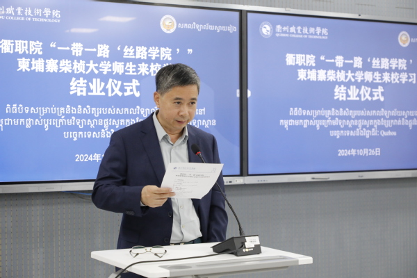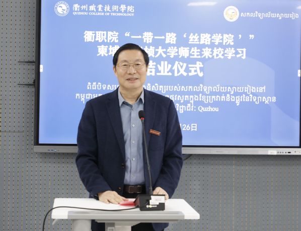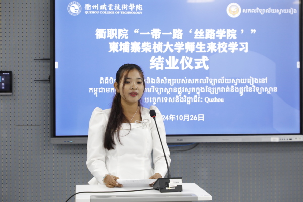 徐须实致辞。他代表学校向柴桢大学18名师生圆满完成留学之旅表示祝贺,向为本次培训班辛劳付出的通天星集团领导,学校的老师、同学、工作人员表示感谢。希望柴桢大学同学们铭记衢职美好记忆。铭记在学校、在衢州的点点滴滴,和学校老师同学常来往、多交流,始终牢记在遥远的中国,有个叫作九游体育(中国)官方网站的学校牵挂着同学们。希望柴桢大学同学们助力两校深度合作。回国后讲好衢职故事,将衢职老师学生们的良好愿望、友好情谊传递给柴桢大学的老师和同学们,为两校深度合作助力。希望柴桢大学同学们成为两国文明使者。回校后能进一步学习中国文化,争做中柬友好往来、文化文明交流的使者。