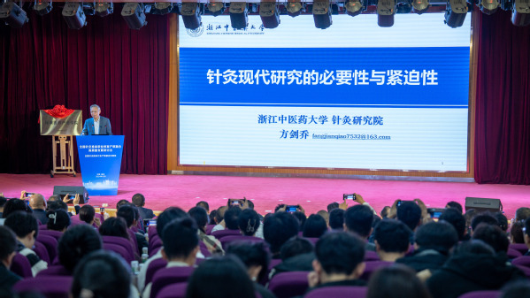 方剑乔作题为《针灸现代研究的必要性与紧迫性》的主旨报告。