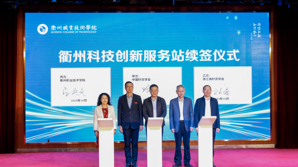 文碧玲宣读由中国针灸学会、浙江省针灸学会、衢职院三方共建的衢州科技创新服务站续签批复。
