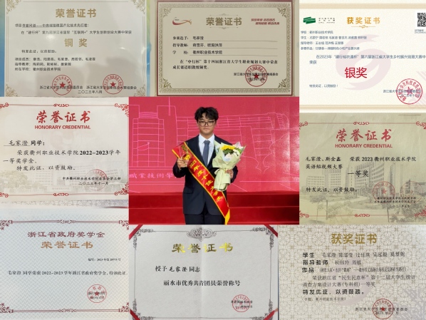 在繁忙的学业与勤工助学工作中,毛家澄还积极参与省、市、县、校等各级比赛和志愿活动,并屡获奖项。他曾获得2023、2024年浙江省大学生统计调查方案设计大赛一等奖,2023、2024年浙江省大学生乡村振兴创意大赛金奖、银奖,2023、2024年浙江省大学创新创业大赛铜奖等省级及以上奖项8项、县市级奖项5项、校级奖项25项、院级荣誉10余项。他还获得了丽水市优秀团员、校十佳大学生、校自强之星等荣誉称号10余项。丰富的经历、积极的态度、热心的服务、良好的成绩,努力向党组织靠拢的行动,让他成为了一名中共预备党员。