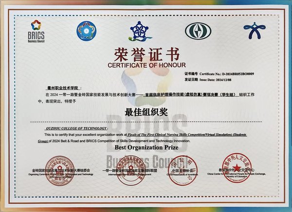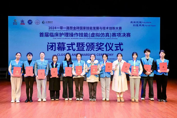 一带一路暨金砖国家技能发展与技术创新大赛由金砖国家工商理事会中方理事会、一带一路暨金砖国家技能发展国际联盟、金砖国家技能发展与技术创新培训中心主办。2024年第八届一带一路暨金砖国家技能发展与技术创新大赛首次将临床护理操作技能(虚拟仿真)纳入金砖系列赛项,该赛项旨在积极推动虚拟仿真技术在金砖五国和一带一路范围内国家的发展与应用,提升临床及护理专业师生的职业核心能力,树立虚拟仿真实训标杆,聚焦临床与护理实践核心技能,以促进临床思维培养为宗旨,全面考查学生基于典型工作任务的核心技能、职业素养等职业胜任能力。