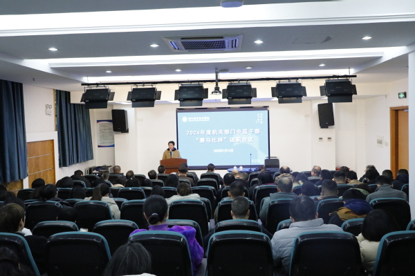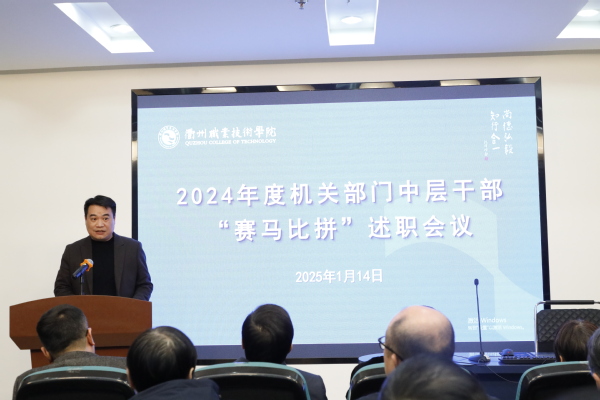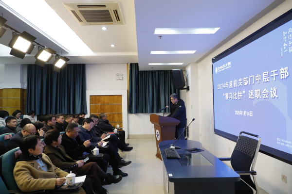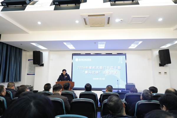 1月14日下午,我校召开2024年度机关部门中层干部“赛马比拼”述职会议。会议由校党委委员、组织部部长周帅同志主持,校领导班子成员及全体机关部门教职工参加会议。