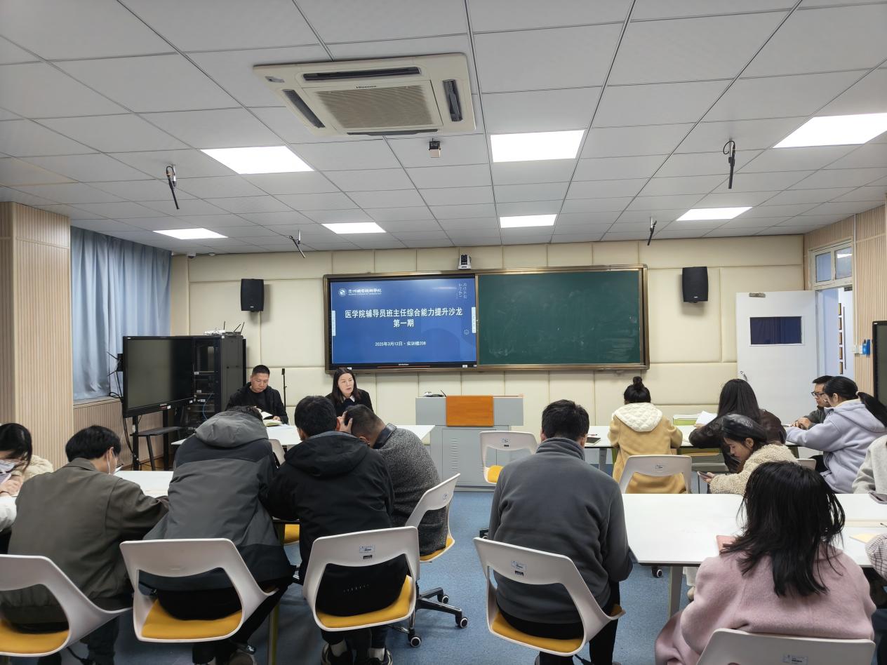 为进一步加强医学院学工队伍建设,拓宽视野、创新思路、分享经验,全面落实立德树人根本任务,提升思想政治教育工作的针对性和有效性,切实解决学生工作的实际问题,近日,医学院面向全体班主任、辅导员举办题为“匠心育人 共话成长”第一期辅导员班主任沙龙,党总支书记洪兴华出席活动,邀请校学工部招生科科长金湛进行经验分享。活动由党总支副书记周贞主持。